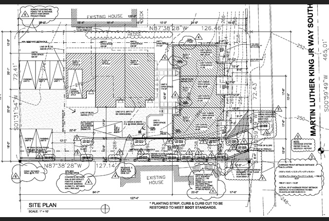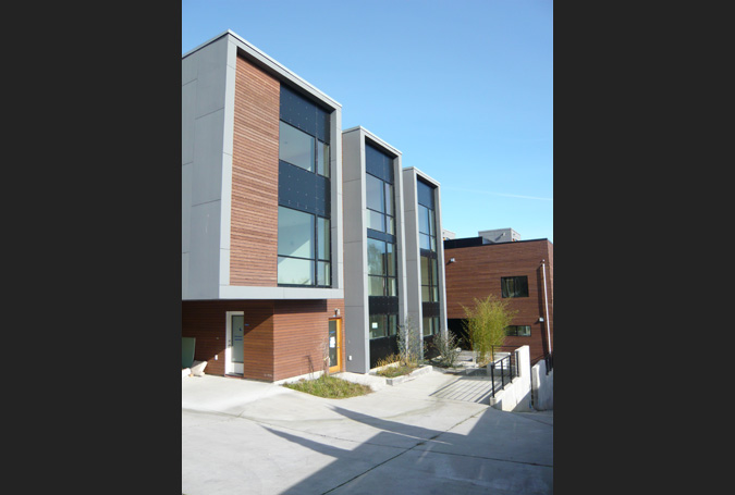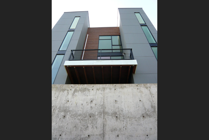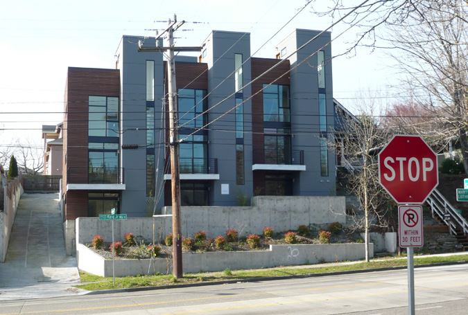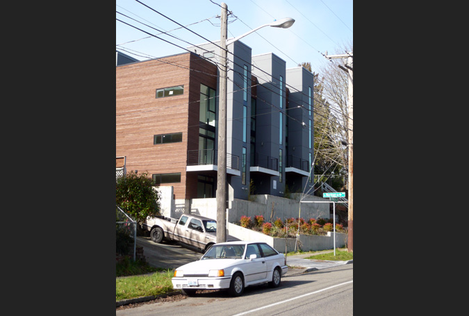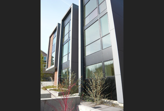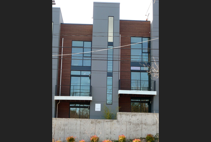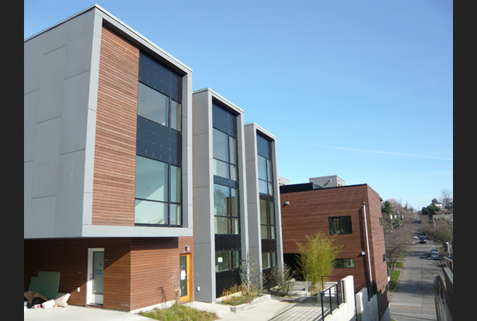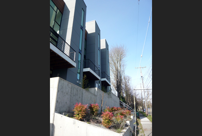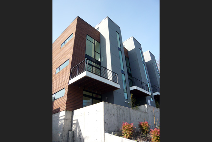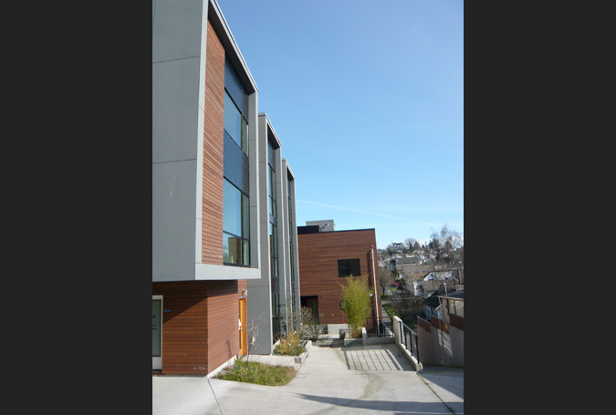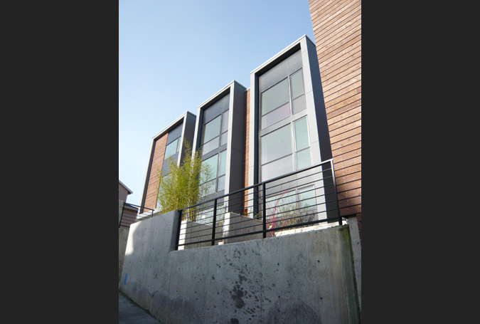 This Project includes 6-Unit Townhouses located in the Central Area neighborhood of Seattle. It consists of two blocks of triplexes set perpendicular to one another along Martin Luther King Jr. Blvd. The Site slopes steeply up from the street. One block of Units fronts the street and negotiates the slope with daylight basements giving these three Units the characteristics of Brownstone Walk-ups. The second block of Units is located behind the front block both of which get access from a centralized Entry/Auto Court.