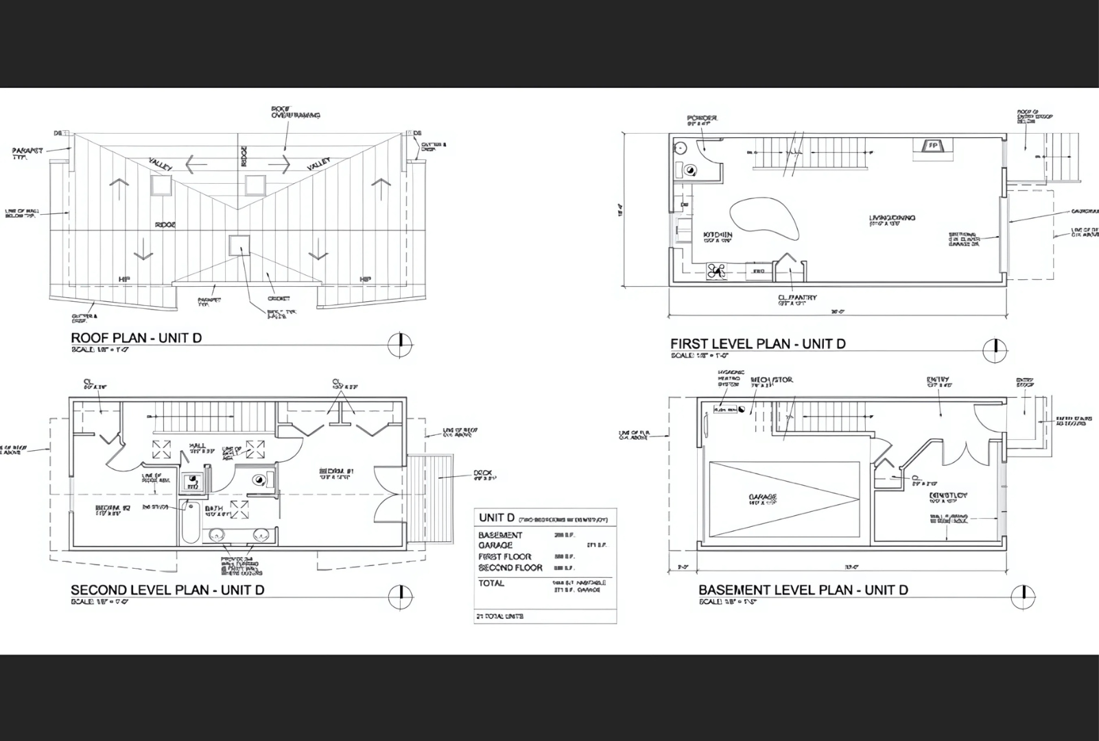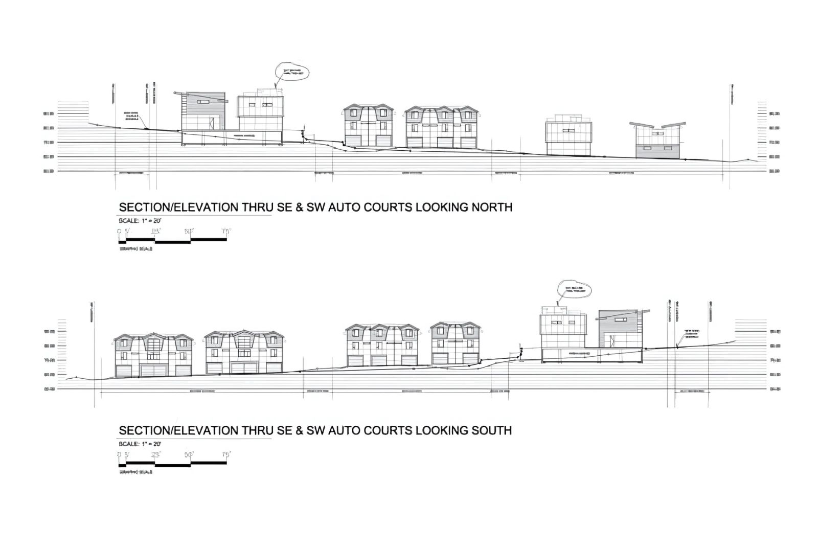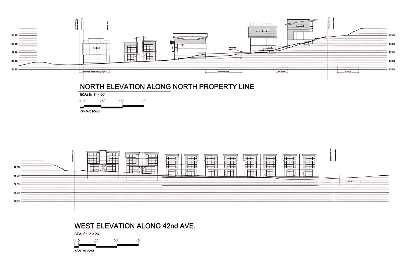 The Site slopes gently down from 42nd Avenue on the West to a Green-belt along MLK Jr. Way to the East. This Green- belt sits underneath a City of Seattle Transmission Line. The Units along 42nd Avenue rest atop a semi-subterranean Parking Structure. Units along Trenton Street feature walk-up Entries and incorporate Garages off an Auto-court to the rear. The balance of the Project is composed of Garden Units, each with its own remote Parking space. These Units are accessed via a series of Garden Paths.