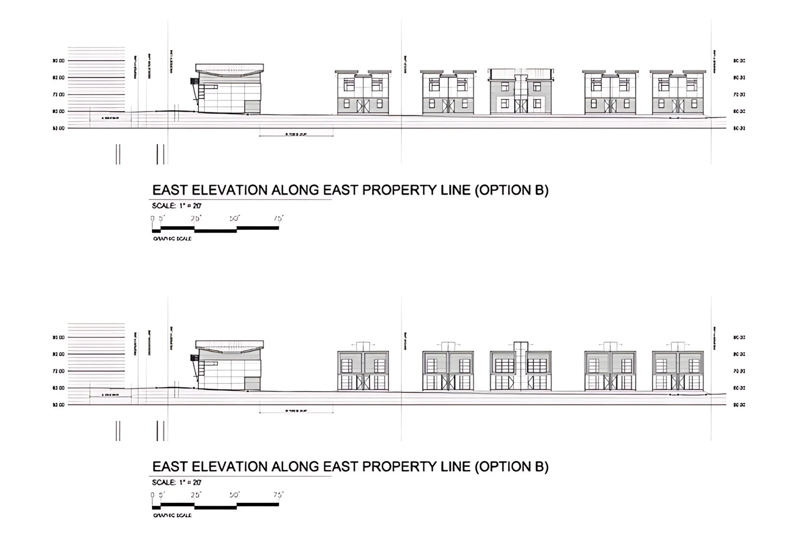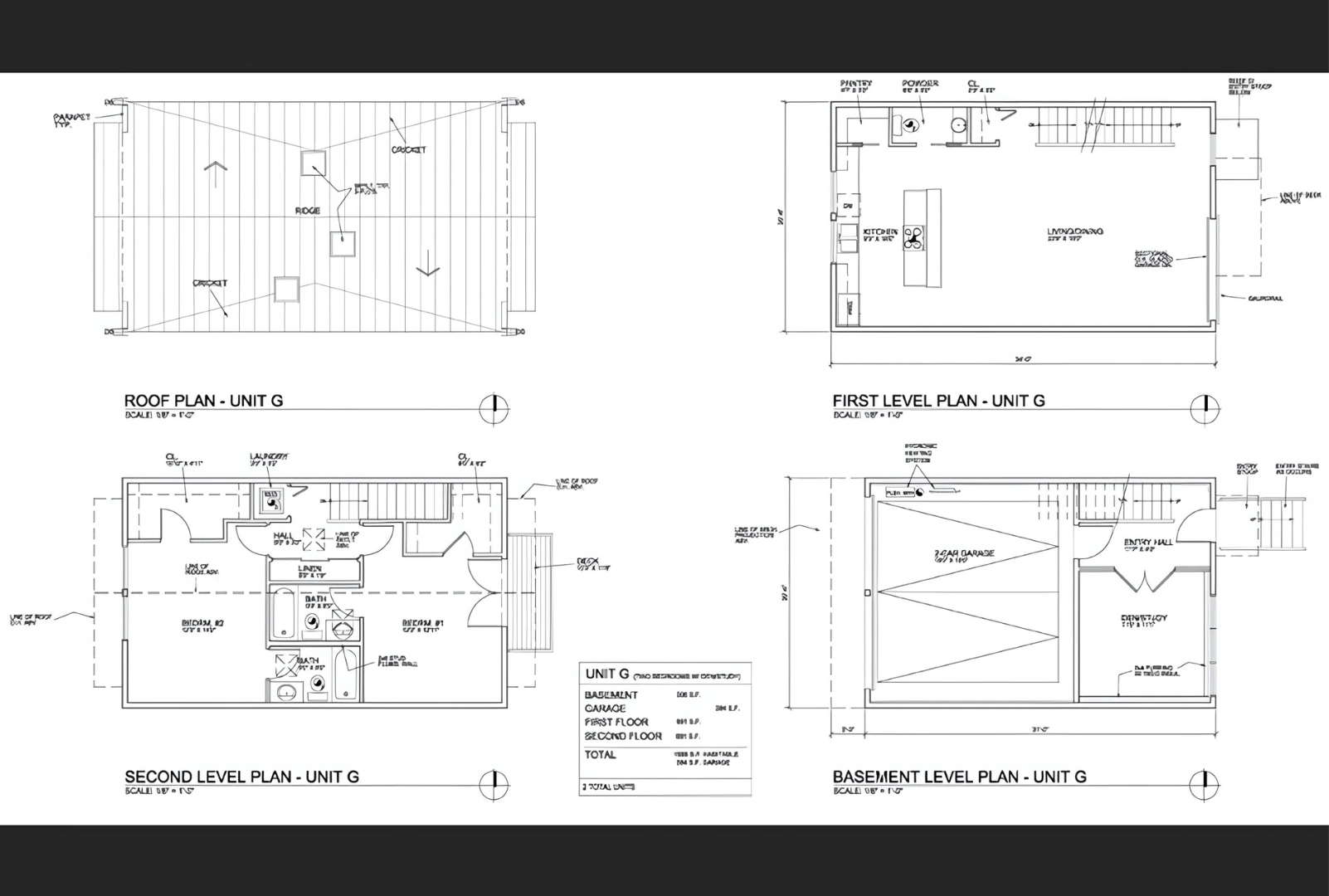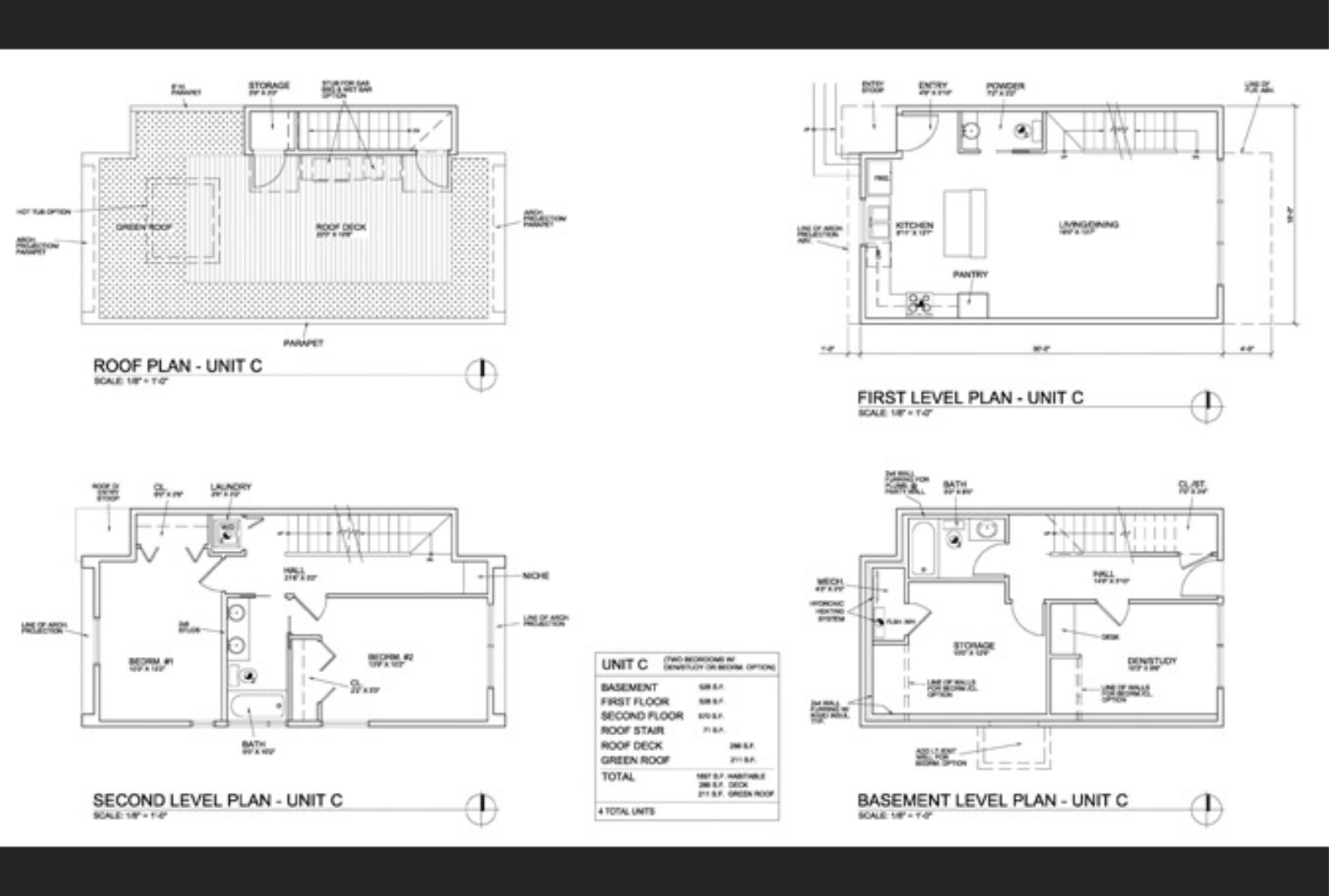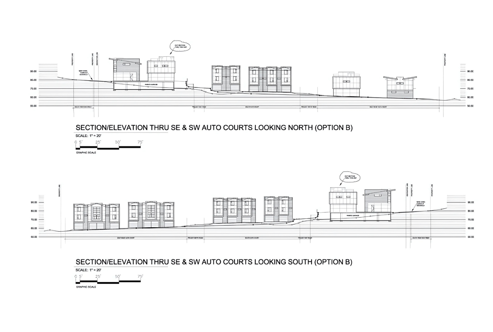The Site slopes gently down from 42nd Avenue on the West to a Green-belt along MLK Jr. Way to the East. This Green- belt sits underneath a City of Seattle Transmission Line. The Units along 42nd Avenue rest atop a semi-subterranean Parking Structure. Units along Trenton Street feature walk-up Entries and incorporate Garages off an Auto-court to the rear. The balance of the Project is composed of Garden Units, each with its own remote Parking space. These Units are accessed via a series of Garden Paths.