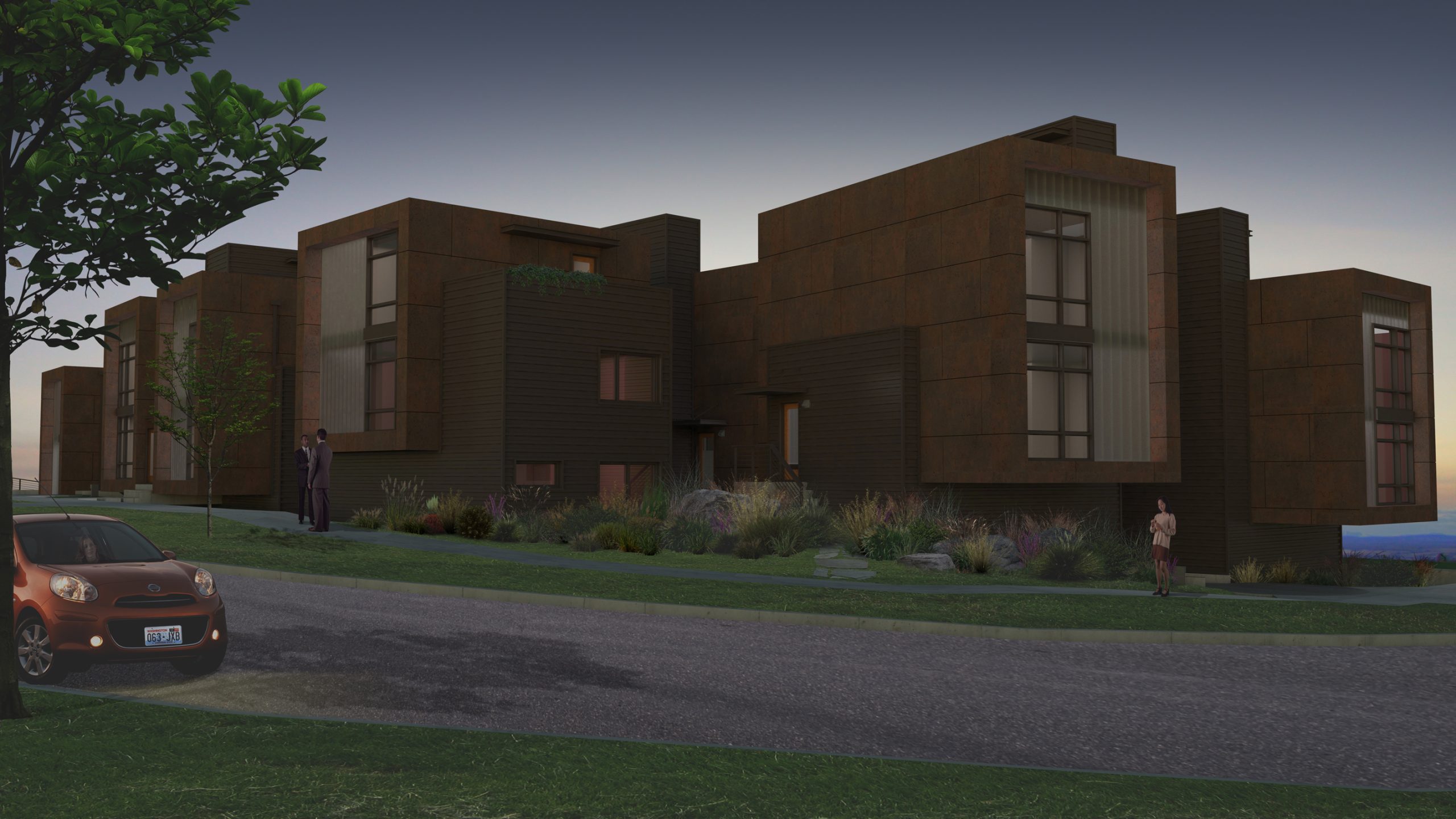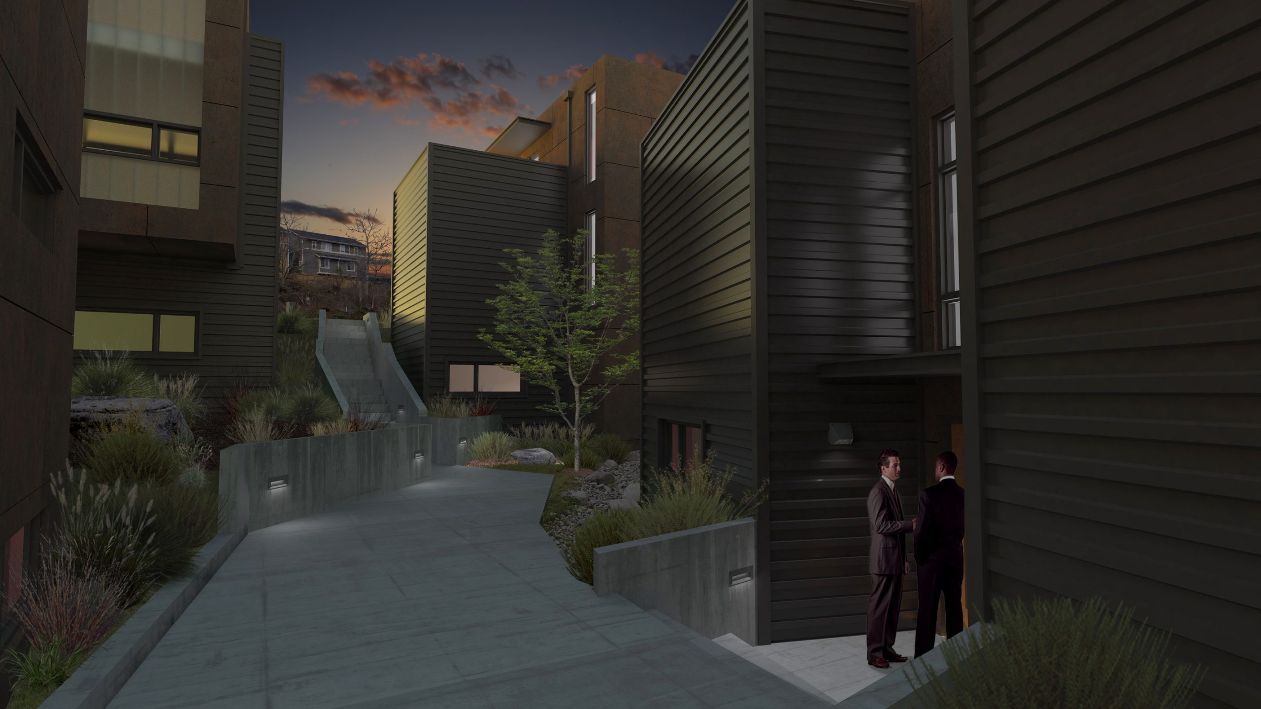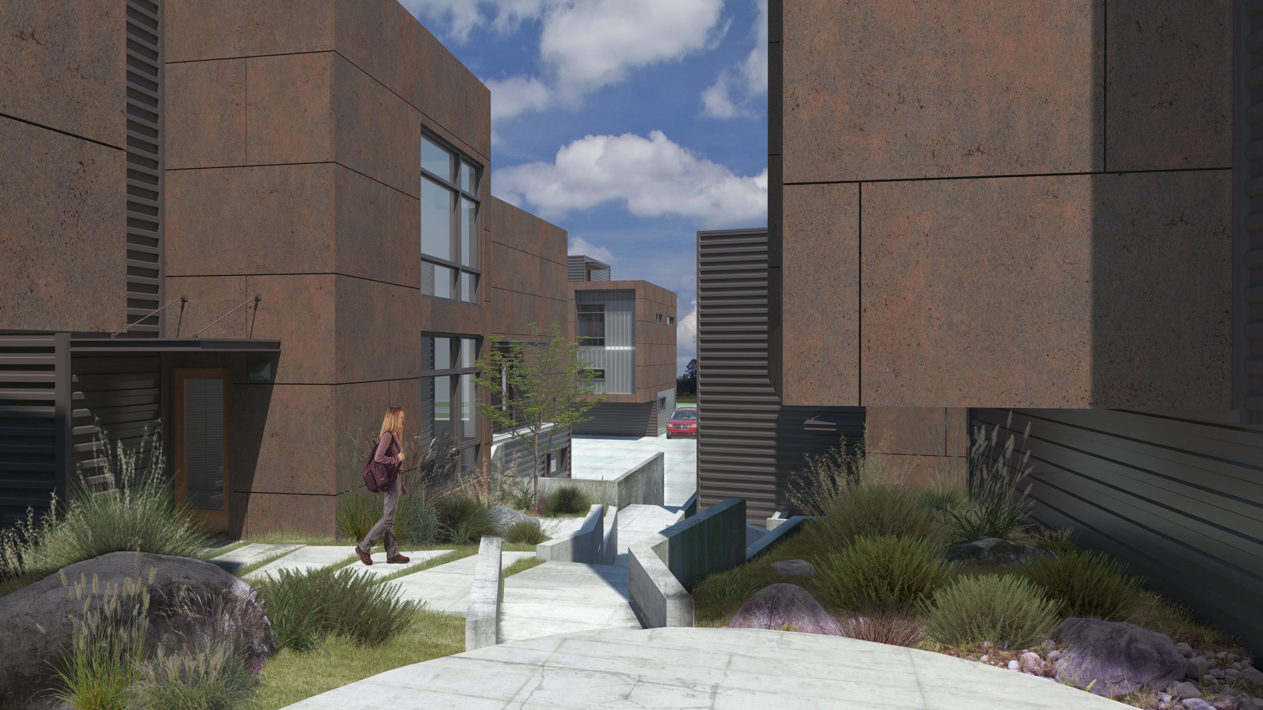 The Project was intended to achieve LEED Platinum certification and will employ many sustainable features. Some of the more significant of these elements include; the Property being a Previously Developed Site, compact floor areas, Rainwater Harvesting, use of Bio-swales along the perimeter of the Parking area, incorporation of Rain Gardens in the Common area, Rooftop Photo-voltaic Panels, Recessed CFL and LED lighting, Tankless Water Heaters, Radiant Floor Heat, Low-e Glazing at all Windows and Doors, Rain-screen Siding, Single-Ply “Cool Roof” Technology, Paperstone Countertops, Exposed Concrete Flooring, Energy Star Appliances and Sprayfoam Wall/Roof Insulation.