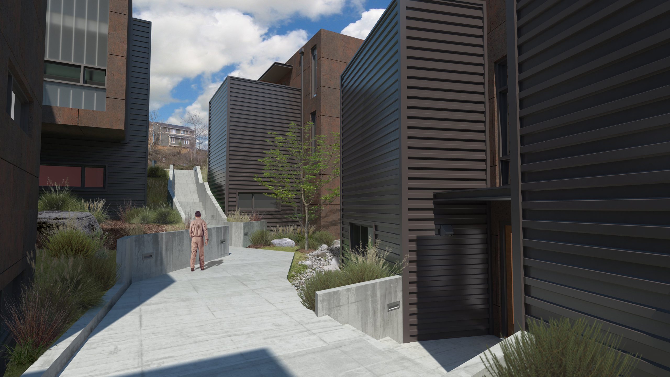 The small village-like environment created by the nine Single Family Units and two duplexes are arrayed and aligned to maximize privacy and views out to the neighborhood. The layout of the Units rejected a strict adherence to the street grid in favor of a more chaotic approach that gives a somewhat “medieval” or “organic” character to the development. This layout simultaneously facilitates the privacy/view opportunities as well as a more unique and interesting perception of the project. Much effort was expended to resolve the figure/ground diagram which would allow the design to comply with the Open Space requirements and provide for Unit access. The “ground” component of this diagram equates to the common space and is critical to the successful experience of the Project. The Units range in size from 1,400 to 1,600 square feet (except for one) with most having three levels and roof decks. A centralized on-grade parking court is located in the middle of the stem of the “T” shaped Site to avoid the view of cars from the adjacent streets. To further distance the development from the cookie cutter craftsman projects inundating the city a modern unadorned aesthetic with flat roofs and parapets is employed. A combination of cement board panels and cedar siding are used to define the exterior of the Units and emphasize the Project’s contemporary expression.